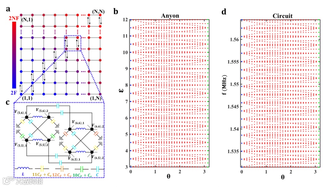 图1. 任意子-电路网络的设计方案和本征能谱。a和c:等效于一维-双体任意子模型的二维-单体紧束缚模型及电路设计。b和d:双体任意子和相应电路网络的本征能谱。
