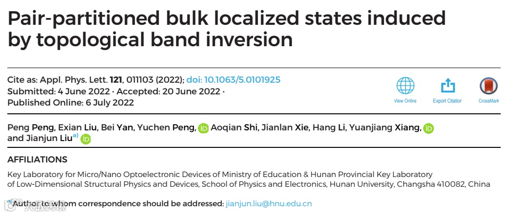 文章链接:P. Peng, E. Liu, B. Yan, Y. Peng, A. Shi, J. Xie, H. Li, Y. Xiang, and J. Liu, “Pair-partitioned bulk localized states induced by topological band inversion,” Applied Physics Letters, 121, 011103 (2022).