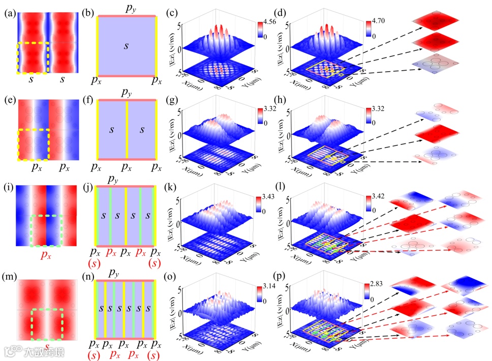 图4 单区及成对分区体局域态的产生原理及其电场分布。由s、px及py态等不同的宇称引起的光场反射及限制机制:(a)具有偶宇称的胞内s态;(b)-(d)单区体局域态,对应频率61.21 THz;(e)具有奇宇称的胞内px态;(f)-(h)成对双区体局域态,对应频率62.01 THz;(i)具有偶宇称的胞间px态;(j)-(l)成对四区体局域态,对应频率64.92 THz;(m)具有奇宇称的胞间s态;(n)-(p)成对六区体局域态,对应频率69.37 THz。