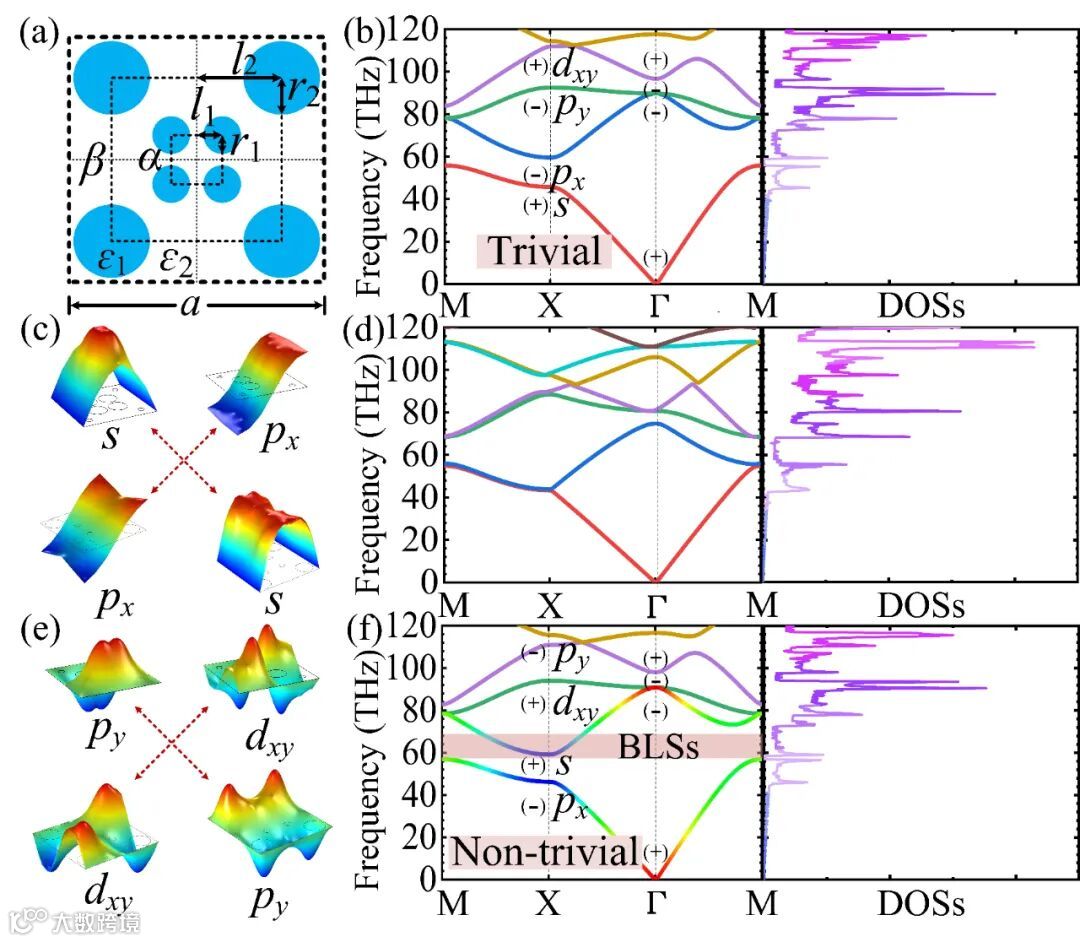图1 (a) 2D IONSL PCs原胞:a = 1.5 μm,l1 = 0.14a,l2 = 0.356a,ɛ1 = 12及 ɛ2 = 1。能带结构及态密度:(b) r1 = 0.12a 且 r2 = 0.06a(γ = r1/r2=2);(d) r1 = r2 = 0.12a(γ= 1);(f) r1= 0.06a且 r2 = 0.12a(γ= 1/2),其中阴影部分为成对分区体局域态能带,图(b)及(f)中X点对应的电场分布分别如图 (c) γ = 2 及 (e) γ = 1/2所示。