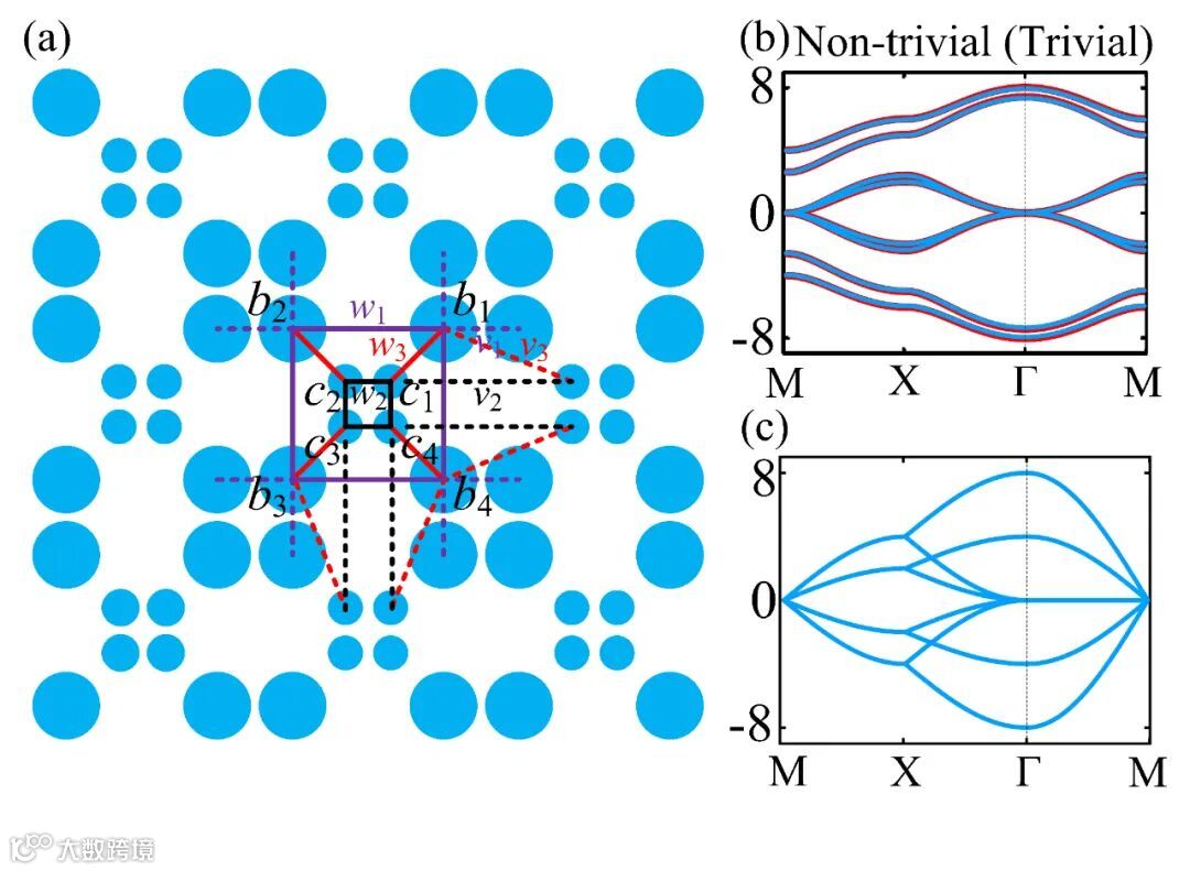 图2 (a) 2D SSH模型:紫色、黑色及红色实线分别表示原胞外圈、原胞内圈及同一原胞的内圈与外圈间的胞内耦合,分别标记为w1、w2及w3;紫色、黑色及红色虚线分别表示外圈与最近邻外圈、内圈与最近邻内圈及外圈与最近邻内圈(内圈与最近邻外圈)间的胞间耦合,分别标记为v1、v2及v3;(b)拓扑非平庸态(w1=1.2,v1=2.5,w2=3,v2=1)及拓扑平庸态(w1=2.5,v1=1.2,w2=1,v2=3)的能带结构;(c) w1=v1=2,w2=v2=1的能带结构。