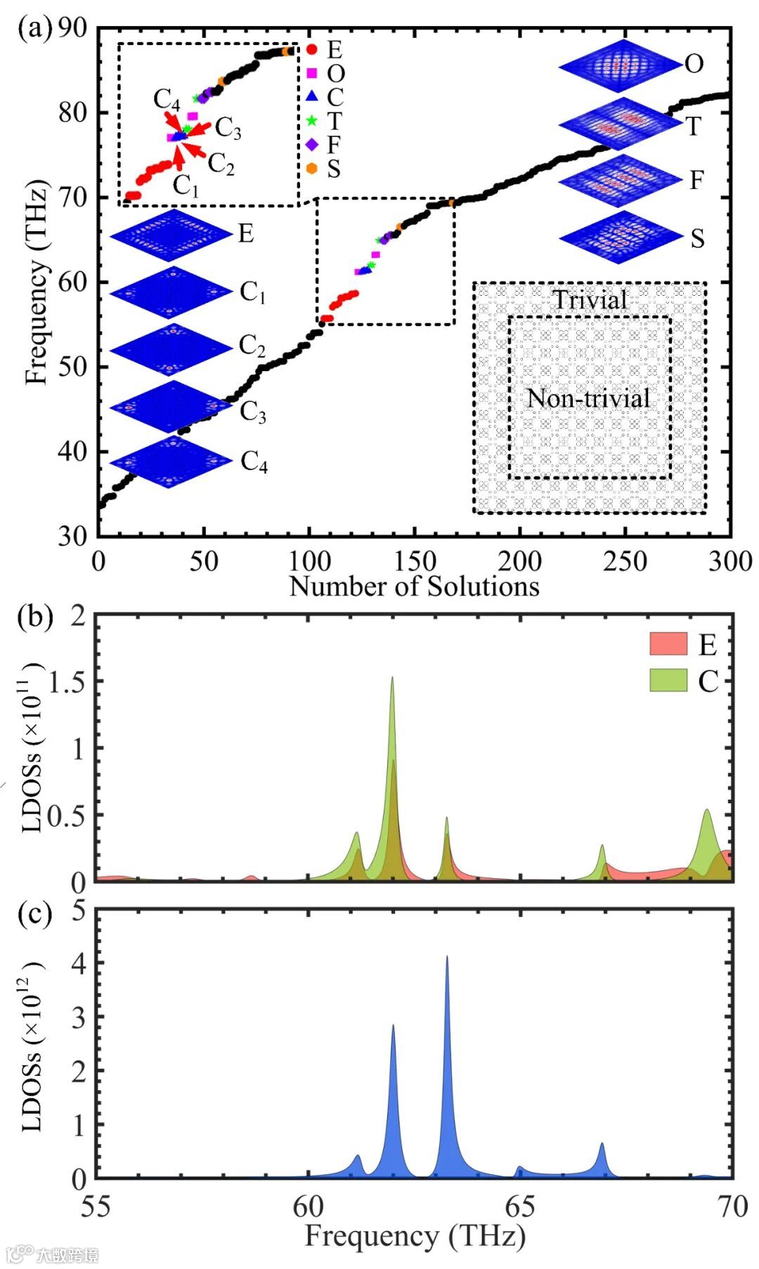 图3 (a) 特征频率30-90THz对应的截断能带结构。右下角的插图为箱形结构排布方式:内部为拓扑非平庸态光子晶体,外部为拓扑平庸态光子晶体;其它插图:边界态(E),角态(C1、C2、C3、C4),单区体局域态(O),成对双区体局域态(T),成对四区体局域态(F)及成对六区体局域态(S);(b)边界态及角态的局域态密度;(c)体局域态的局域态密度。