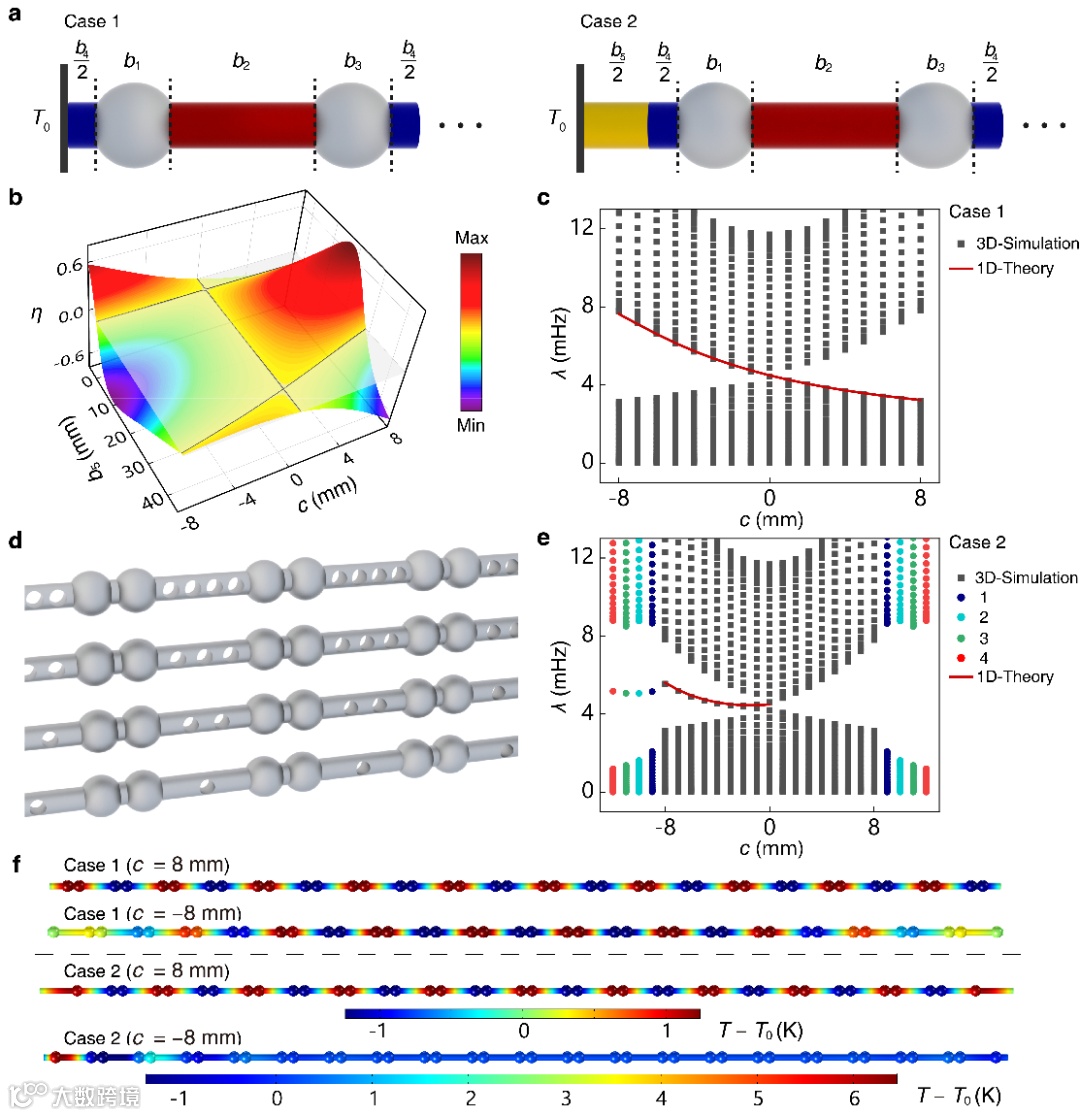 的3D图。 c) 情况1的特征值分布。 d)优化模型。 e) 情况2的特征值分布。f) 体态或边界态的温度分布。