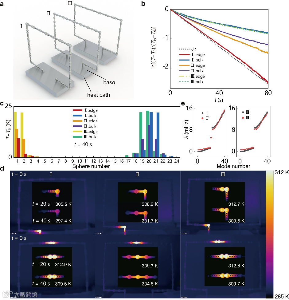 图4实验设置和结果。 a) Ⅰ、Ⅱ、Ⅲ物理模型。 b) 最大降温速率曲线。 c) t = 40 s时模型的温度分布。纵坐标表示球体的相对温度。横坐标代表球体编号 (1 - 40) d) 系统的热像图。e) 模型Ⅰ和Ⅲ的实验测量(红色)和模拟(黑色)特征值。
