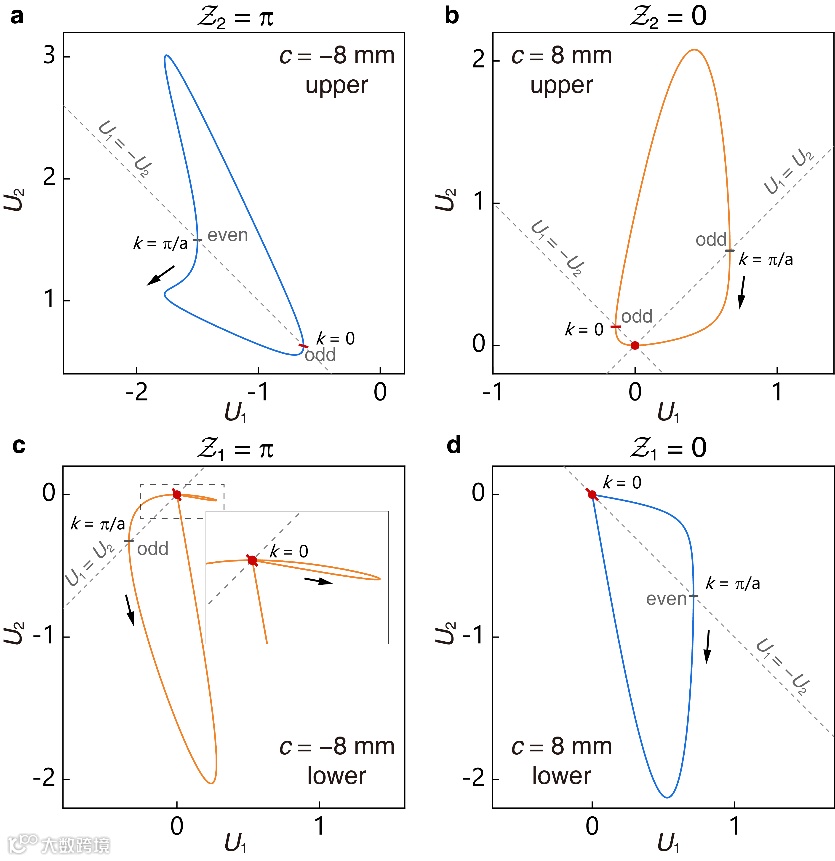 图2状态向量的轨迹图。U在上能带(a,b)和下能带(c,d)中随k从