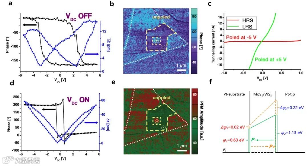 图2. MoS2/WS2双层异质结中的铁电性表征 (a)(d) 直流电场关闭和开启时压电力显微镜测量得到的电滞回线 (b)(e) 压电力显微镜测量得到的相位图和振幅图 (c)(f)不同极化状态下的隧穿电流—直流偏压关系及其铁电隧穿结模型示意图