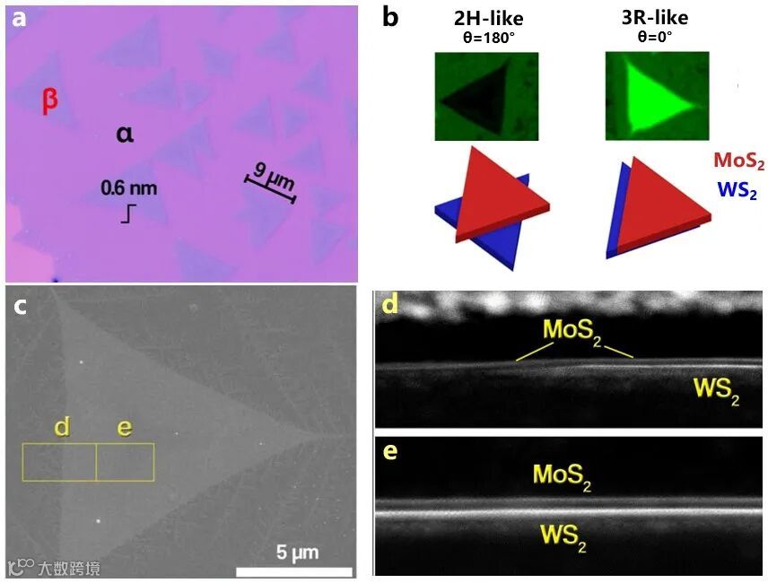 图1. CVD法生长的MoS2/WS2双层异质结 (a) 双层异质结的光学显微镜图像 (b) 两种不同堆叠结构对应的二次谐波信号 (SHG) (c)平面SEM图像,两个黄色的矩形框所选区域分别对应于(d-e)的横截面扫描透射电子显微镜图像