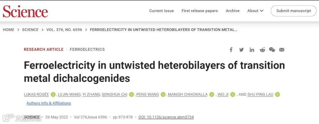 2020年10月,中国人民大学物理学系季威教授研究组及合作团队通过理论计算和实验测量发现了世界上首个单分子驻极体Gd@C82,在驻极体被人类合成100年后将其物理尺寸压缩到极致的单分子水平(~1 nm,十亿分之一米)。近日,他们与香港理工大学刘树平教授研究组及英国剑桥大学Manish Chhowalla教授等合作,在低维极化材料领域又获重要突破,通过理论计算和实验测量,国际上首次在仅有6个原子层厚的非转角二维双层异质结中发现了面外压电及铁电效应。该成果深化了对二维材料新奇物性的认识并扩展了铁电材料的家族成员,展示了二维铁电材料在未来信息存储应用中的潜力。相关研究成果以“Ferroelectricity in Untwisted Heterobilayers of Transition Metal Dichalcogenides”(非转角过渡金属硫族化合物双层异质结中的铁电性)为题发表在2022年5月27日出版的世界顶级科技期刊《科学》上。[Science 376, 973-978 (2022) DOI: 10.1126/science.abm57]