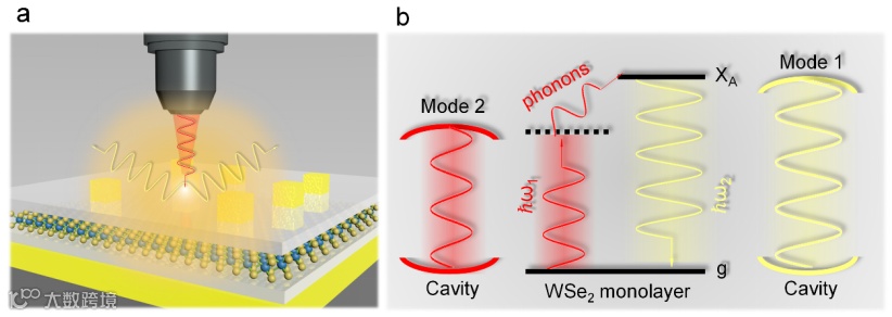 图1.(a)等离激元微腔增强激子上转换发光器件原理示意图;(b)激子上转换发光与等离激元微腔双重共振模式示意图。