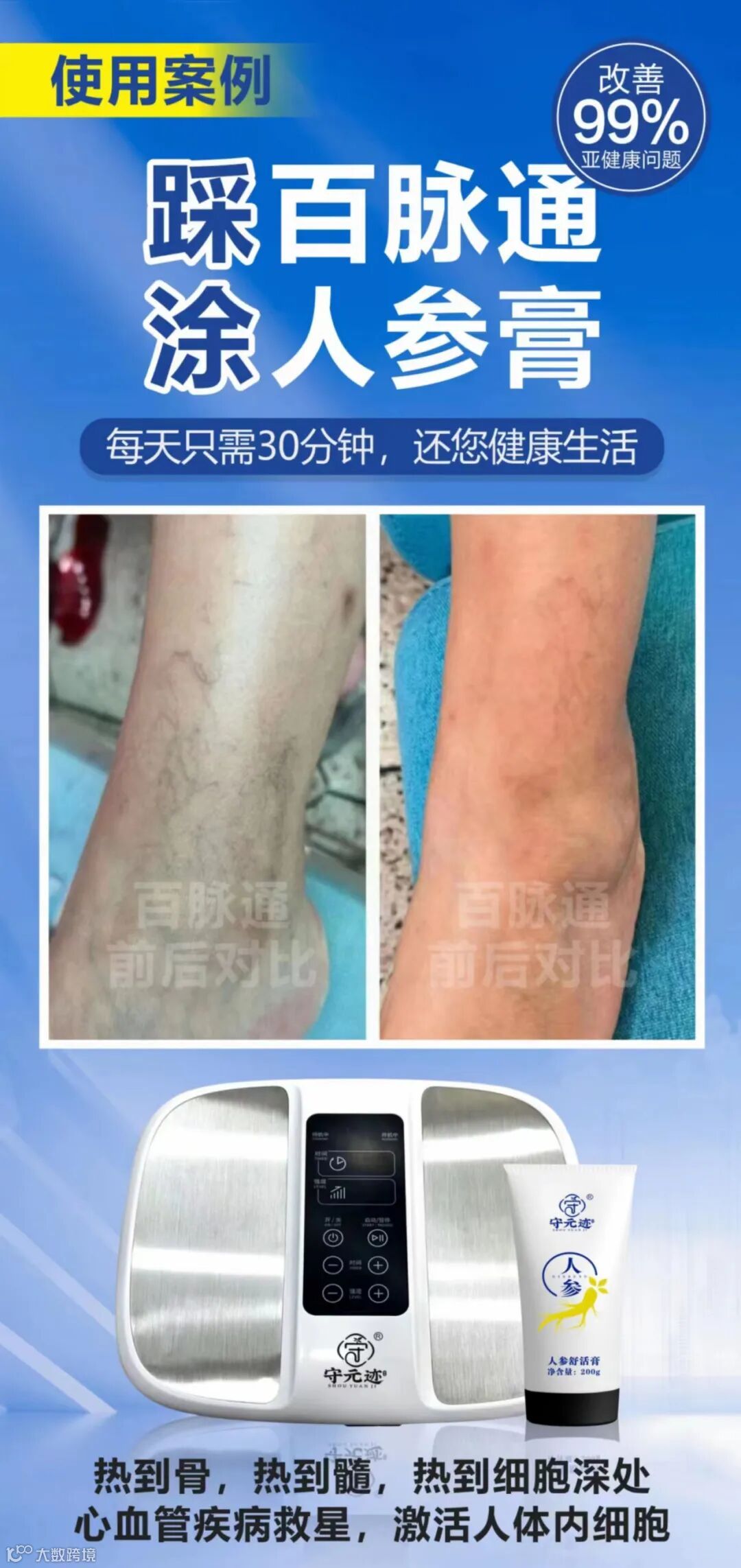 守元迹独家研发人参舒活膏,搭配百脉通使用,中药材能快速渗透体内,透皮吸收,能快速排出体内的风寒湿三大邪气,同时能疏通身体的淤堵经络,打通人体气血循环。活血化瘀,就可以改善湿寒淤堵引起的所有病症如促进脚的血液循环,加快自身的新陈代谢,刺激大脑的皮质,改善睡眠质量,疏通经络、帮助去除湿气、缓解慢性疾病等好处。