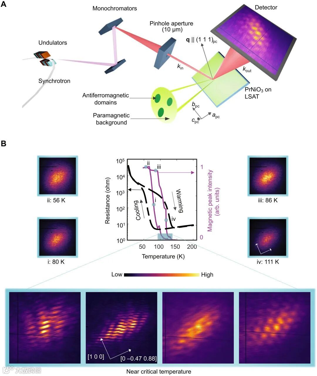 反铁磁畴和拓扑反铁磁结构的检测和操作是固体物理学研究的重要问题。相关研究的一个基本步骤是要确定用于探测反铁磁序参量介观结构的工具。在本文中作者证明了布拉格相干衍射成像可以扩展到使用共振磁 X 射线散射,并用于研究反铁磁有序参量的介观结构。作者对PrNiO3中反铁磁转变的涨落状态开展研究,重点关注束斑中反铁磁畴被稀释的温度区间,此时调制反铁磁峰的相干衍射图案可被大大简化。作者证明,可以从单个衍射图案中提取这些畴的排列和大小,并且该方法可以扩展到时间结构光源,以研究稀畴的运动或者拓扑缺陷在反铁磁自旋结构中的运动。