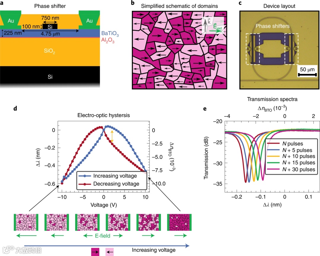 IBM欧洲研究院的Jacqueline Geler-Kremer教授课题组基于BaTiO3薄膜与硅波导的集成,制备了一种铁电多级非易失光学相移器。相关成果以“A ferroelectric multilevel non-volatile photonic phase shifter”为题,在Nature Photonics上发表。