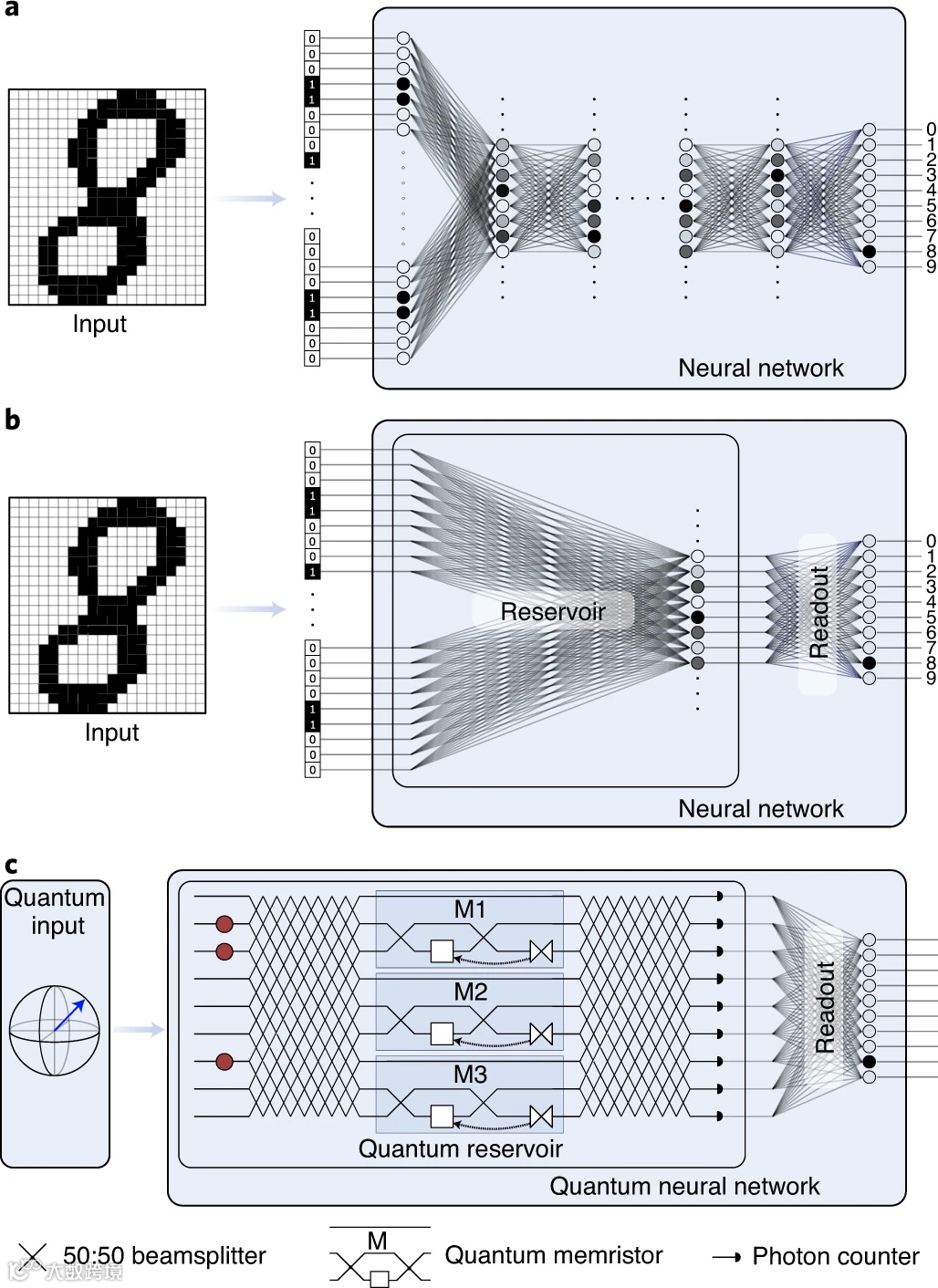 他们展示了一个只有3个量子忆阻的系统,在仅仅1000张图像的训练后,就能以95%的准确率学会分类手写数字。作者报告说,几个经典的储备池计算方案在准确性上不及量子的方案,同时也需要更多的计算资源和数据。