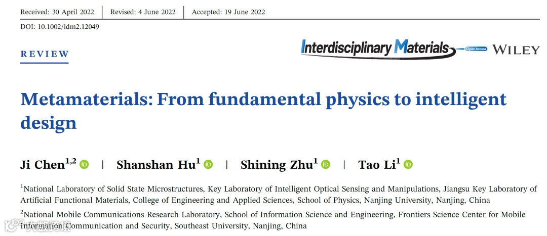 近日,南京大学祝世宁院士、李涛教授团队以“Metamaterials: From fundamental physics to intelligent design”为题在新刊Interdisciplinary Materials上(DOI:10.1002/idm2.12049)发表综述文章。文章以超构材料的物理原理与超构材料设计为主线,系统地介绍了该领域的重要研究成果与数十年来的发展脉络,并着重介绍了近年来人工智能算法被引入该领域,使得超构材料器件表现出了智能化的功能和优异的性能。综述最后对该领域未来的发展和面临的挑战做出了分析和展望。