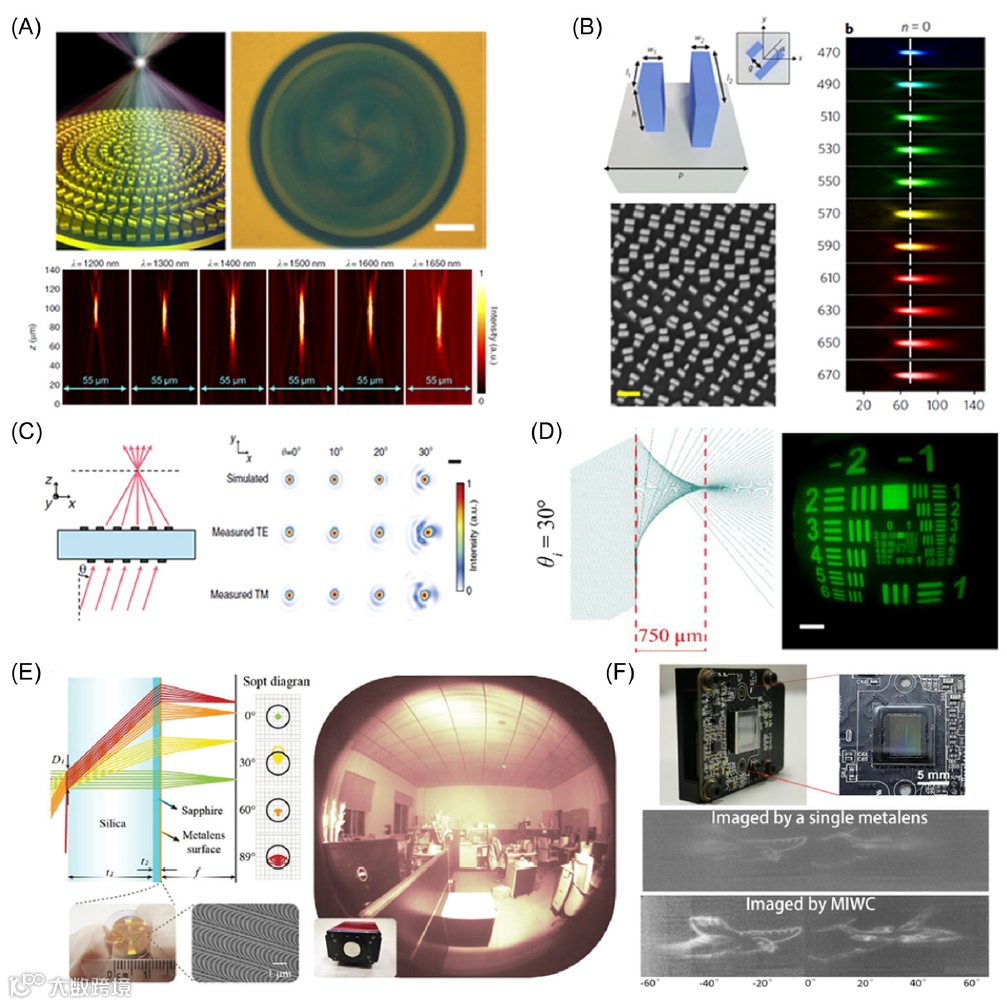 图二 超构透镜成像——(A,B)消色差超构透镜,(C-F)广角超构透镜。
