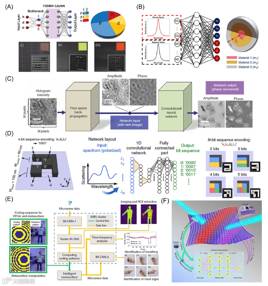图三 (A-D)智能算法设计超构材料,(E,F)自适应智能超构器件