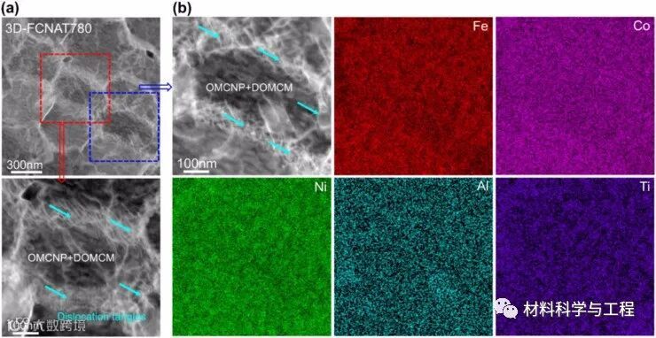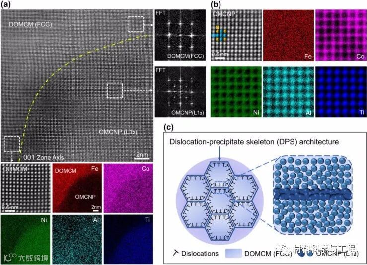 图8 (a)高分辨率高角度环形暗场(HAADF) STEM图像显示了L12型有序多组分纳米沉淀物(OMCNP)和FCC无序多组分基体(DOMCM),并确认了界面相干性,能量色散X射线能谱(EDX)图显示了OMCNP和DOMCM的成分分布。(b)原子分辨率HAADF-STEM图像和相应的EDX图,显示了OMCNP中Fe、Co、Ni、Al和Ti的原子分布和位置。(c)由OMCNPs和HDDs网络组成的位错-析出相骨架(DPS)结构示意图。