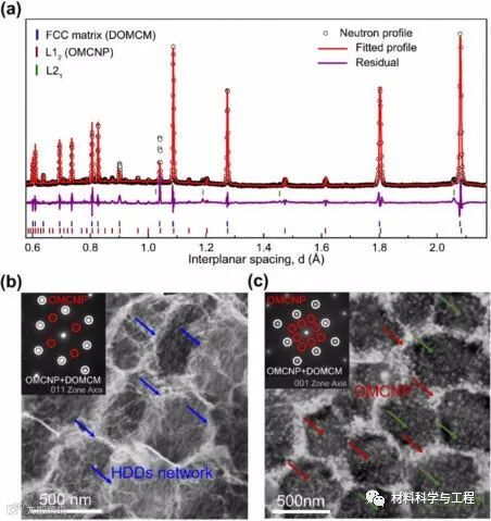 图5 (a) 3D-FCNAT780的中子衍射(ND)谱。(b) 3D-FCNAT780的亮场(BF)扫描透射电子显微镜(STEM)图像,显示高密度位错(HDDss)网络结构。(c) 3D-FCNAT780的BF STEM图像,显示了由DOMCM和OMCNP组成的亚粒结构。