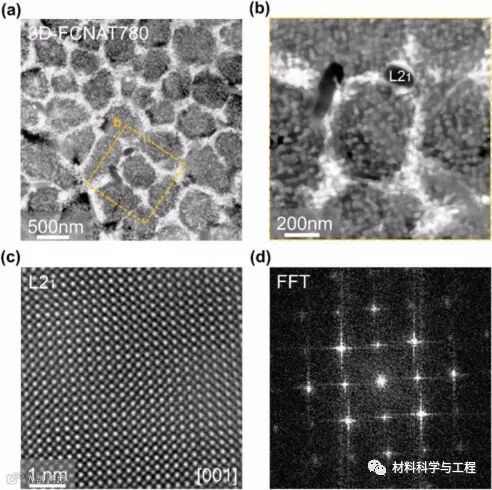 图7 (a) 3D-FCNAT780的BF STEM图像显示了由OMCNP、DOMCM和少量L21组成的亚粒。(b)局部子粒特征区放大图。(c) L21高分辨率HADDF-STEM影像。(d)图c中对应区域的快速傅里叶变换(FFT)模式显示了L21的超晶格结构。