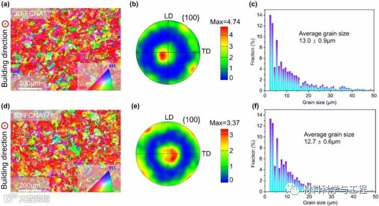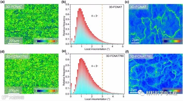 图4 (a) 3D-FCNAT高角度晶界大于15°的核平均取向误差(KAM)图。(b) 3D-FCNAT的局部定向错误和相对分数。(c) 3D-FCNAT的KAM图的局部区域放大(扫描步长设置为30 nm)。(d)3D-FCNAT780的高角度晶界大于15°的KAM图。(e) 3D-FCNAT780的局部定向错误和相对分数。(f) 3D-FCNAT780的KAM图的局部区域放大(扫描步长设置为30nm)。
