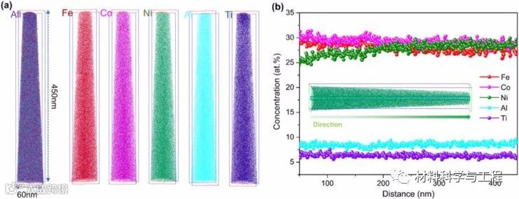 图2 (a)三维fcnat重构Fe, Co,Ni, Al和Ti原子的三维APT尖端。(b)一维(1D)浓度剖面,显示了三维APT尖端的所有元素分布。