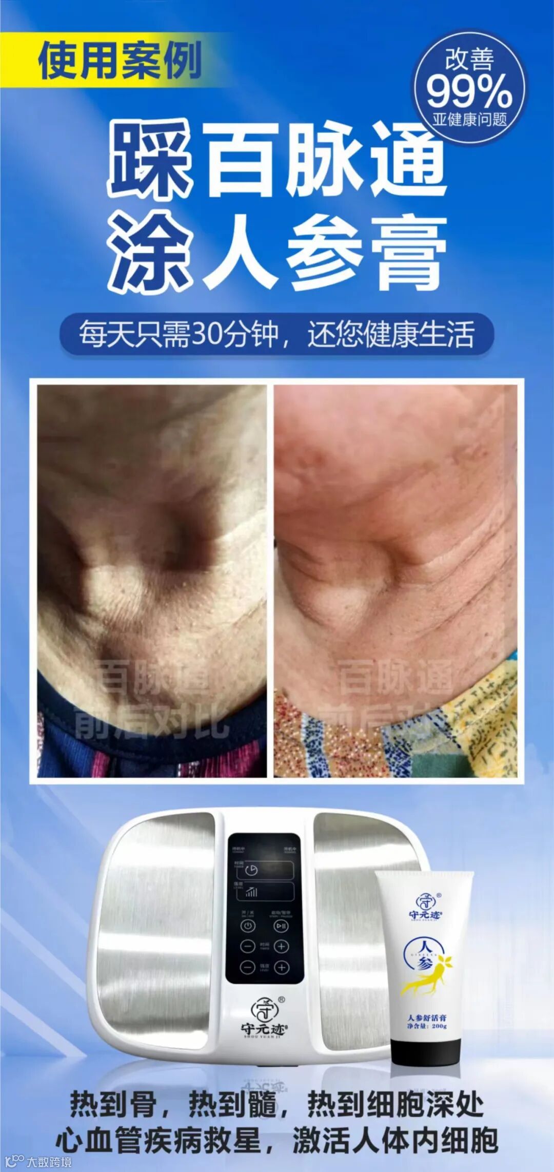 通过短短30分钟时间,踩百脉通实现与人体细胞同频共振,从人体内部产生热量,养气血, 快速打通人体微循环, 疏通经络, 祛除寒湿, 补充生命细胞能量,激活免疫力。