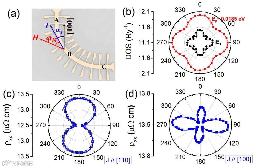 图1. (a)单晶铁铂有序合金的各向异性磁电阻测量示意图(b)自旋轨道耦合作用下费米能附近态密度随磁矩方向的变化:当电流沿[110] (c)和沿[100] (d),实验测量的电阻率随磁矩方向的依赖关系