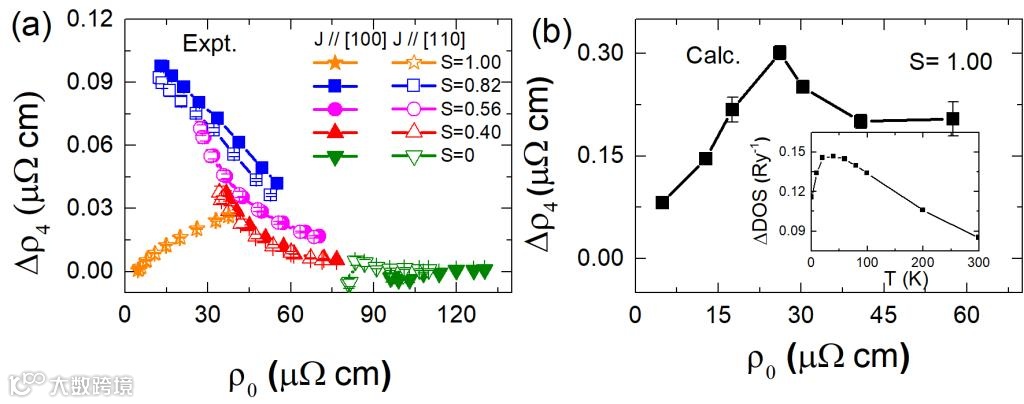 图2. (a) 实验测量四度对称各向异性磁电阻(b) 理论计算完全有序铁铂合金的四度对称项随电阻率的变化,插图表示有限温度费米面态密度的各向异性
