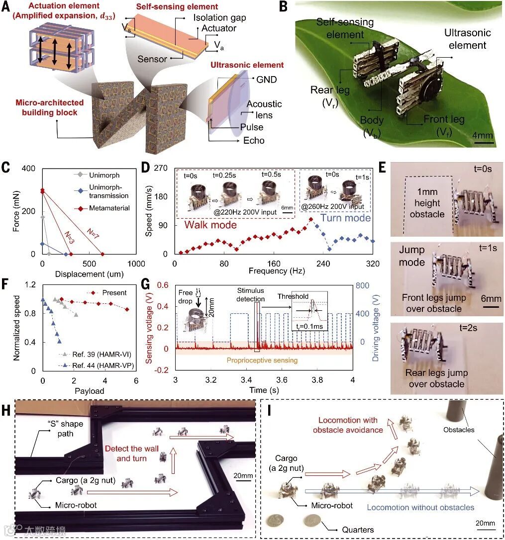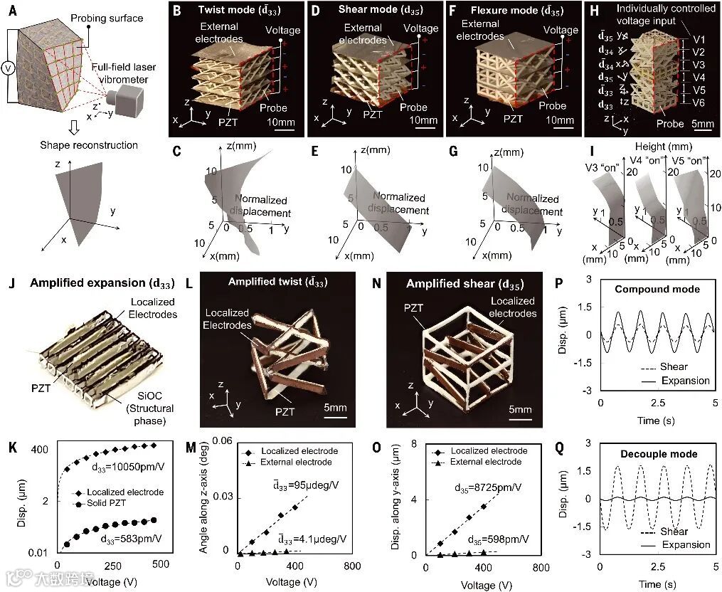 由增材制造的机器人超材料可以使用电场到机械应变的双向转换来产生运动和传感。逆压电效应赋予机器人驱动能力,而直接和双向压电效应分别通过本体感受(自我监测)和外感受(接触检测和遥感)实现反馈控制。超材料的拓扑结构允许将电极直接放置在压电活性支柱上,从而产生更强的电场并放大驱动应变。