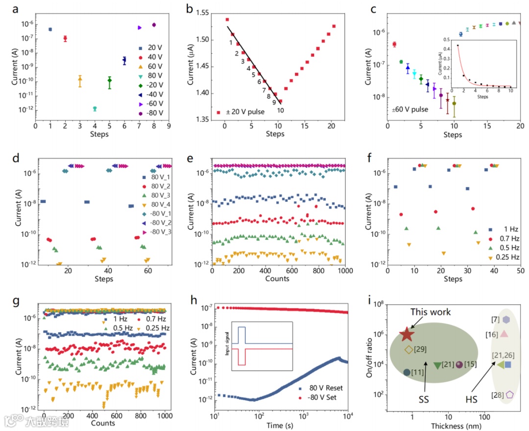 近日,清华大学深圳国际研究生院成会明院士刘碧录副教授课题组报告了一种基于褶皱结构构建存储设备的方法,其中褶皱引起的局部应变可以捕获和释放载流子,从而实现器件的开关存储特性。该课题组报道在单层MoS2的转移过程中,利用PET转移及其快速冷却过程中与MoS2的不匹配的热收缩过程,在样品中制备褶皱结构。基于褶皱MoS2的晶体管不仅具有较高的开关比(106),且展现出明显的电学回滞窗口。回滞产生的原因是MoS2表面的褶皱能够产生电子束缚态而将被正栅压激发的部分电子束缚住,使得器件处于高阻态;而负栅压能将被束缚的电子释放回原来的位置,从而使器件恢复到低阻态。他们也采用导电原子力显微镜结果验证这一电子束缚和释放过程。同时,通过不同脉冲栅压刺激(脉冲幅度,频率,次数等)可调控褶皱MoS2存储器内部载流子浓度,从而使器件处于不同的阻态。同时,该存储器件集成了线性和指数响应行为,适合计算单元和存储单元的多功能、多场景应用。此外,这类器件还展现出较长的存储时间(>104 s),高开关比,高稳定性和重复性等特点。该研究提出通过褶皱结构设计的方法以调控二维存储器件载流子的束缚过程,为相关器件在超薄、柔性电子学领域的应用提供了一种新的解决方案。