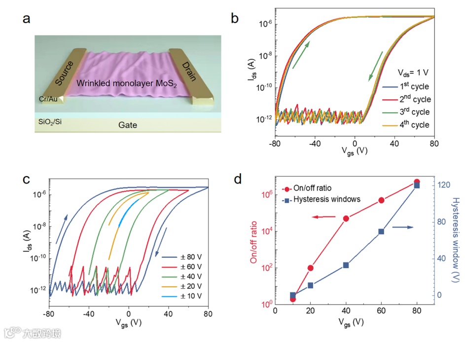 图2. 基于褶皱MoS2的FET器件示意图及电学转移特性