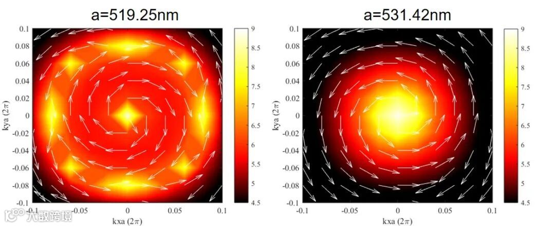 如图所示,当晶格常数为519.25nm时,除了Γ点外,还有周围八个亮点,即为偶然BIC,此时每个BIC的品质因子与波矢的关系为Q∝1/k2。在每一个亮点周围,其模式的远场辐射偏振箭头图构成一个涡旋,从而我们类比于OAM那样定义该BIC的拓扑荷(topological charge)。而当晶格常数变为531.42 nm时,八个偶然BIC全部靠近了Γ点,产生了Merging的效果,即Γ点的Q值分布变成了一个硕大的风暴,满足Q∝ 1/k6。当进一步增大晶格常数,异号的偶然BIC叠加相消,倒空间只剩下了Γ点的对称性保护BIC。