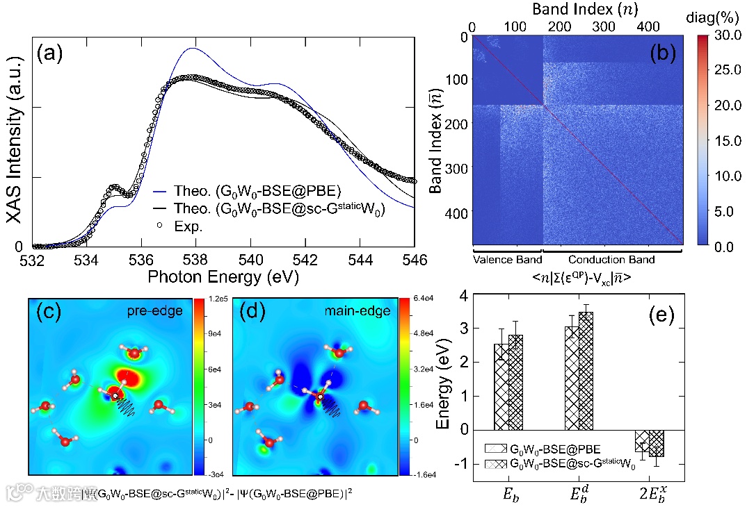 图3. (a)基于不同波函数(准粒子波函数与DFT波函数)的理论X光吸收谱结果;(b)水的自能矩阵示意图,图中白色矩阵元意味着准粒子波函数与DFT波函数之间的差分示意图;(c)位于pre-edge和main-edge的激子波函数在两种计算方法下的区别;(d)激子结合能的组成分解。