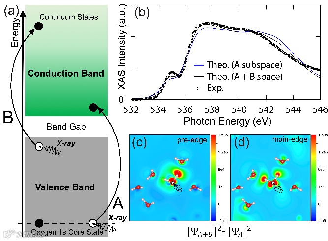 图4. (a)构成液态水X光吸收谱的跃迁贡献示意图:A空间为1s电子到导带底附近的跃迁,B空间为价带到高能级连续态之间的跃迁。(b)考虑在不同空间中的跃迁对X光吸收谱的影响;(c)(d)为pre-edge和main-edge的激子波函数在不同空间跃迁的差分示意图。