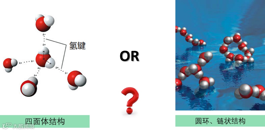 图1. 关于液态水局域结构的不同观点:(左)传统观点认为水是由氢键网络组成的四面体结构;(右)论文(1)提出的液态水的局域结构是由氢键网络组成的圆环、链状结构,这里的水分子之间的氢键被大量破坏。