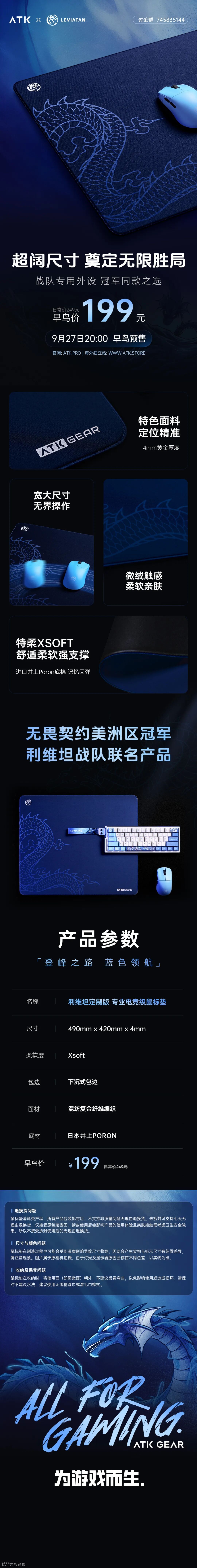 ATK 利维坦联名款专业电竞级鼠标垫,490mmx420mm无界尺寸,稳定承载大幅操作,始终无碍滑行,复合纤维表面,微绒触感,细腻丝滑,提供足够制动,日本进口井上poron棉【Xsoft】自研软感支撑,提供足够缓震力,战队专用外设,冠军同款之选!