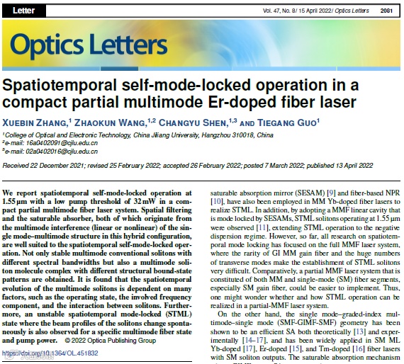 Xuebin Zhang, Zhaokun Wang,Changyu Shen, and Tiegang Guo,“Spatiotemporal self-mode-locked operation in acompact partial multimode Er-doped fiber laser”, Opt. Lett. 47, 2081 (2022). DOI: 10.1364/OL.451832