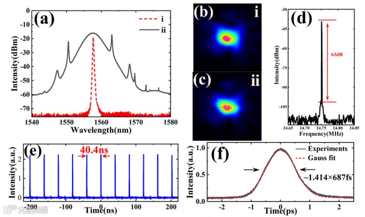 图2 部分多模结构的时空锁模光纤激光器输出特性:(a)锁模与连续光光谱图;(b-c)锁模状态及连续光状态下得输出光斑图;(d)频谱图;(e)脉冲序列;(f)自相关曲线。