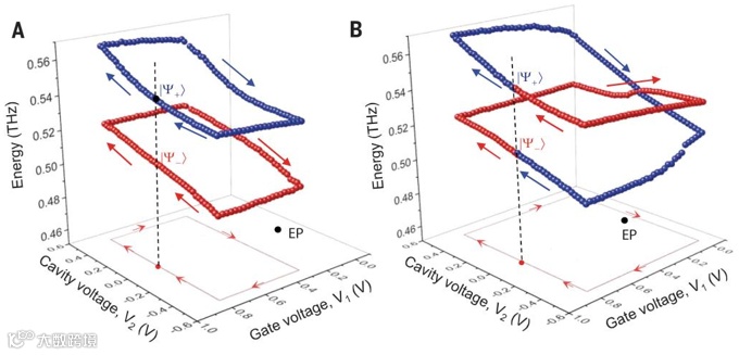 在这项新的研究中,研究人员巧妙的构造了一个能够通过电压精准调节太赫兹光的耗散不平衡和频率失谐的装置,准确控制系统的状态,绘制出奇异点附近的黎曼面,并深入研究相关的拓扑性质。