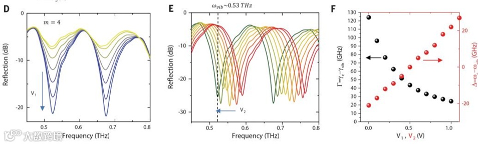 研究人员首先证实可以通过改变两个电压独立地对谐振器的损耗和频率进行调节(图3D和3E)。结果表明,电压 V₁ 和 V₂分别在 0V 到 1V 之间调节时,频率失谐和耗散不平衡可调节的幅度分别达到 ±25 GHz 和 100 GHz。