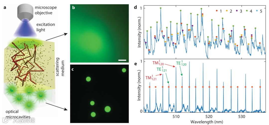 近年来,利用生物和生物相容性材料制造的用于研究各种生物系统的光学微腔和微激光器受到了广泛关注,且最近被用作活体细胞和组织内的探针。细胞追踪、生物传感和超分辨率成像等方面的应用已得到证实,但大多限于细胞培养。它们的主要优点是光谱窄,对环境高度敏感。在不同类型的微腔中,基于球形微粒全内反射的whispering gallery模式(WGM)微腔是最常用于生物应用的微腔,WGM微腔通常尺寸小,Q因子高,制造简单。尽管在强散射生物组织中有许多新的光学成像方法,但在弹道光传输机制之外的单细胞分辨率成像仍然非常具有挑战性。