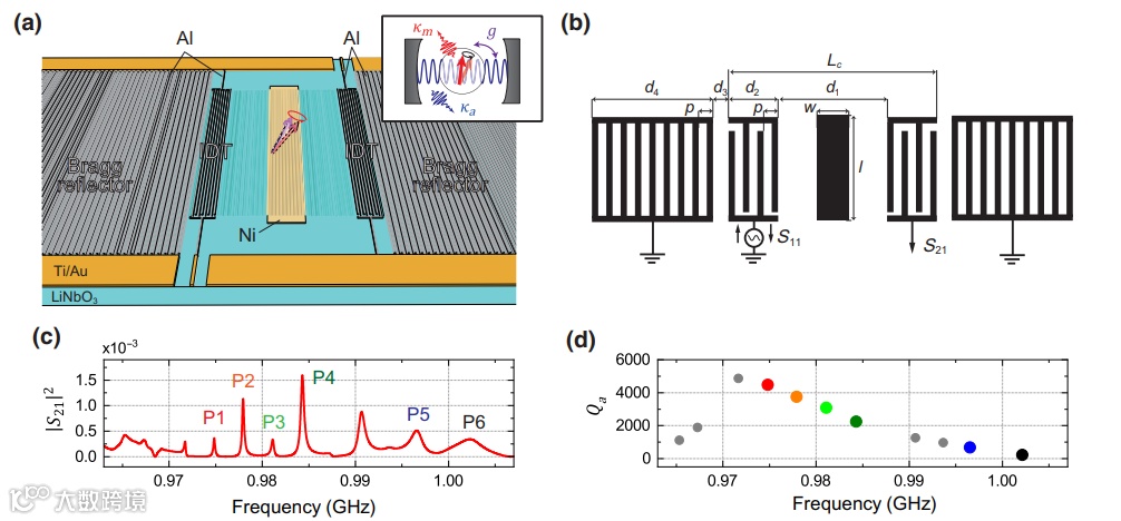 与电磁微波相比,声波的波长较短,传播速度较慢,在千兆赫兹的频率下,不会向自由空间造成辐射损失。这些特点使得声学设备一般比较小巧,可以进行相干信号处理。因此,了解声子相互作用并加以利用,可以将声子的这些有利特性引入其他物理系统,并扩展混合系统的功能。通过磁弹性耦合的磁子-声子相互作用激起了力学和自旋电子学领域的跨学科研究,千兆赫兹自旋振荡可以通过电磁腔共振与兆赫声振动进行参数化相互作用,并与适宜频率的振动共振耦合。此外,与声子杂交的磁子能够获得声子的低损耗特性,并形成磁弹性波(磁子极化子),从而改善相干性。另一方面,声子获得磁子的磁化率,携带自旋角动量,并显示出非互易传播。目前,声表面波设备可以通过声学驱动自旋波振荡,这种芯片级磁机械结构可以利用平面集成电路的短波长。与铁磁性球体和体声波谐振器不同,它与当前基于声表面波的传感和通信设备技术兼容然而,目前的实验主要集中在行波上,行波的弱相互作用使得很难深入探究共振磁子-声子耦合的特征。