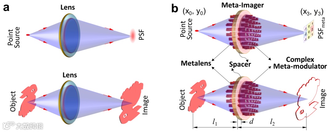 图1 (a)透镜成像原理;(b)实现任意运算的全光卷积芯片(Meta-imager)工作原理。