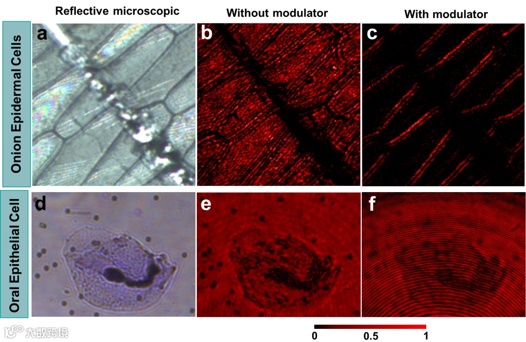 其次,该团队展示了实现微分和去噪算子的全光卷积芯片,并将其用于滤除洋葱表皮细胞中的定向缺陷和口腔上皮细胞中的随机缺陷。如图3(a-c)所示,处理后的图像具有无缺陷的洋葱表皮细胞的长轴边缘, 同时消除几乎平行于微分方向的洋葱表皮细胞的短轴边缘;带有随机噪点的口腔上皮细胞经去噪型全光卷积芯片进行图像处理后,尽管存在背景,但缺陷内的强度均匀性得到改善,如图3(d-f)。