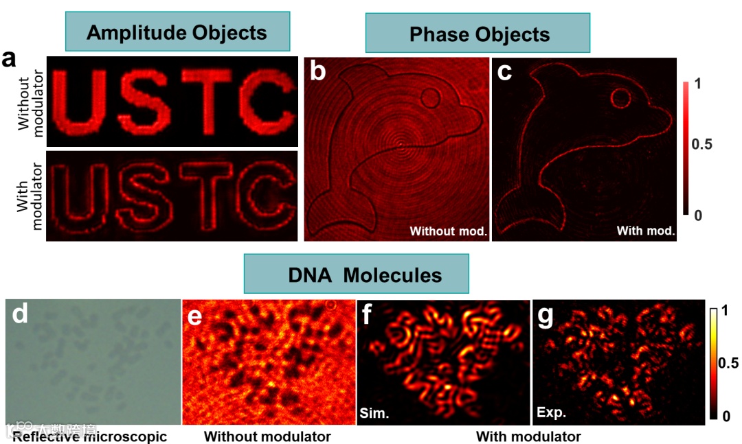 图2 (a)振幅物体和(b-c)位相物体以及(d-g)DNA分子的边缘检测。