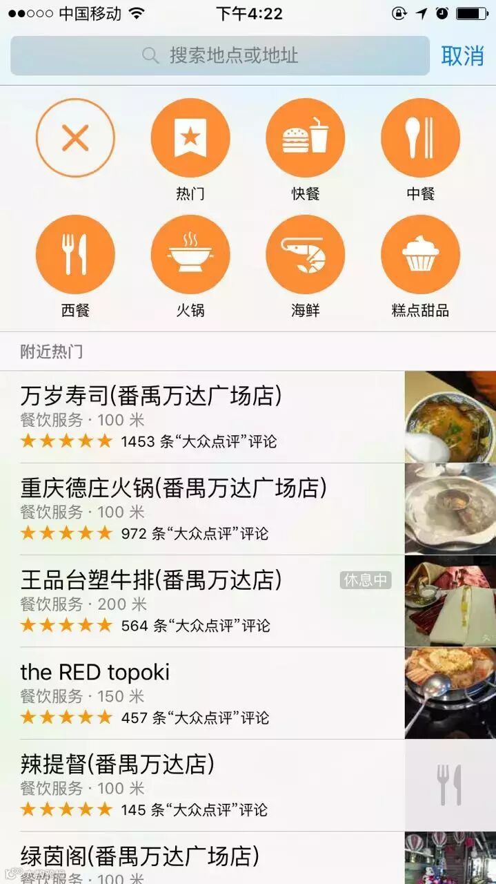 苹果还提升了地图的实用性,在屏幕地图上会直接告诉你附近有哪些美食,这些数据来自大众点评。