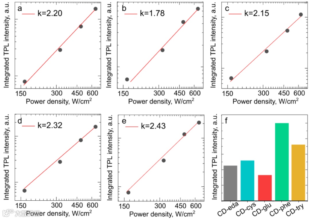 图7:(a-e)双光子激发发光(two-photon excited luminescence,TPL)的积分强度对五个 CD 样品的激发功率密度的依赖性:(a)CD-eda,(b)CD-cys,(c)CD-glu,(d)CD-phe,(e ) CD-try。(f)五个 CD 样品的综合 TPL 强度的比较。