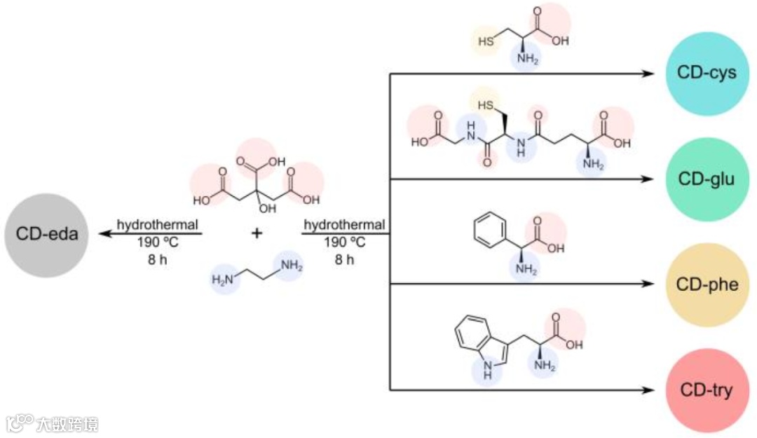 图1:使用常见的前体柠檬酸和乙二胺合成的非手性 CD 样品(CD-eda),以及用一组不同的手性前体 L-半胱氨酸,L-谷胱甘肽、L-苯基甘氨酸和 L-色氨酸分别合成的手性 CD 样品(CD-cys,CD-glu,CD-phe,CD-try)的示意图。前体分子中的化学官能团(羧基、氨基和硫醇)分别用蓝色,红色和黄色半透明圆圈突出显示