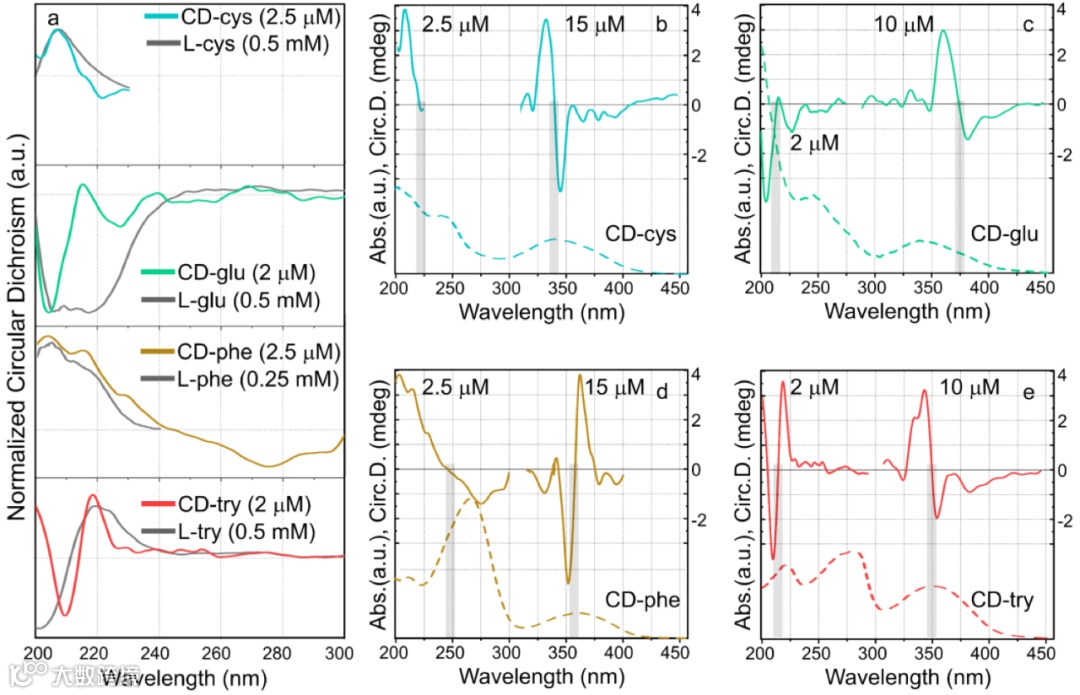 图5:(a) 四种前体分子(灰线)的归一化圆二色光谱与紫外光谱区手性 CD 的比较;CD 及其前体的浓度在括号中给出,虚线表示零电平。(b-e)四种手性 CD 样品的吸收光谱(虚线)和圆二色性(实线)光谱:(b)CD-cys,(c)CD-glu,(d)CD-phe,和(e)CD-try。圆二色性信号的值在每个图表的右侧给出。灰色矩形突出强调圆二色光谱中的符号变化。为清楚起见,(b-e)中给出了圆二色光谱特定区域的 CD 浓度。