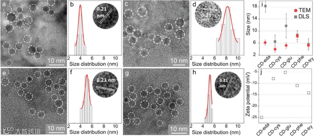 图2:不同 CD 样品的形态:(a,b)CD-cys, (c,d)CD-glu, (e,f)CD-phe, (g,h)CD-try. (a,c,e,g)为TEM图像。(b,d,f,h)为尺寸分布直方图,插图为 HRTEM 图。(i) 从 TEM 图像(红色圆圈)和动态光散射(dynamical light scattering,DLS)测量值(灰色方块)中估计的 CD 尺寸的比较。(j) CD 样品的 Zeta 电位。